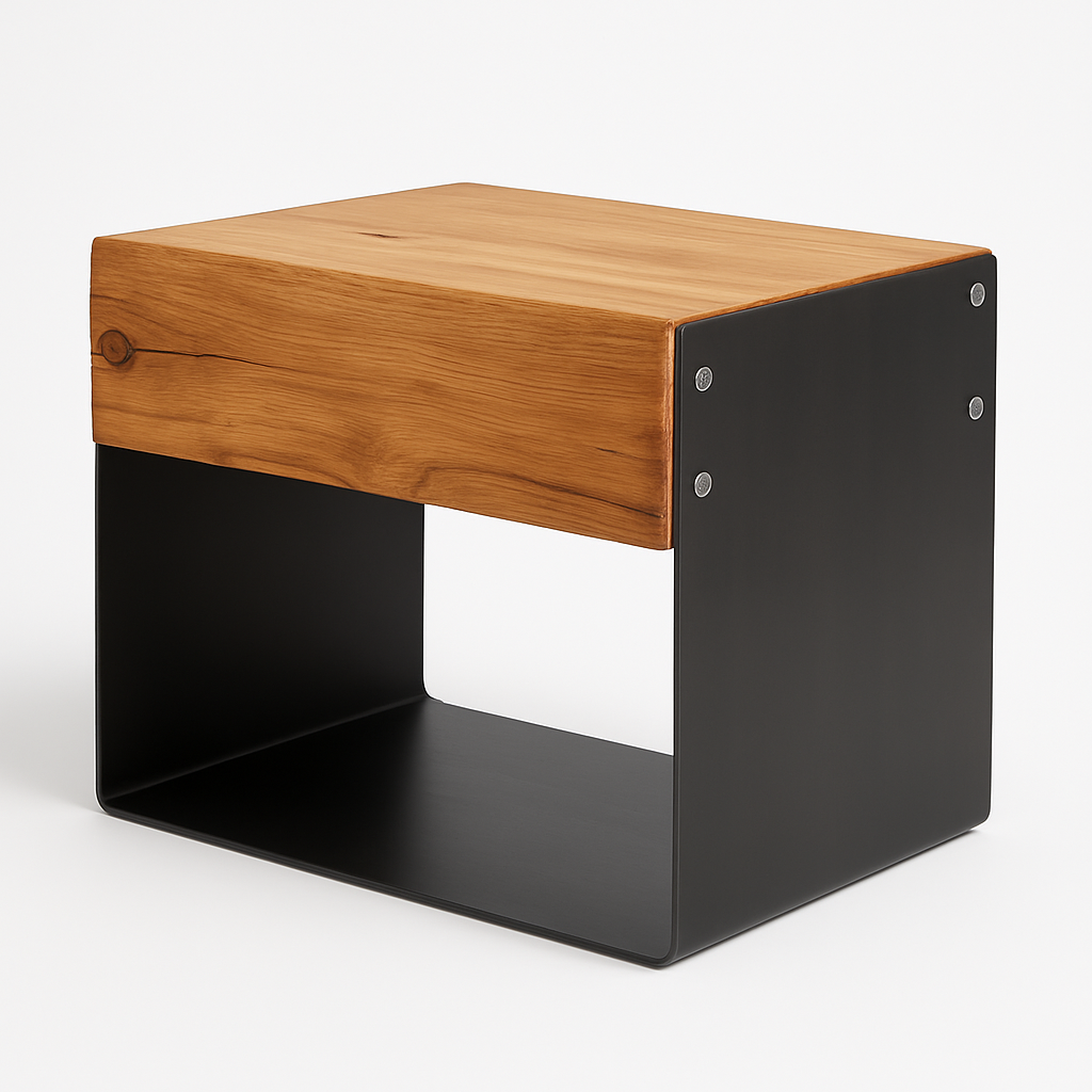A thick slab of solid wood meets industrial steel panels, secured with exposed rivets for a bold, handcrafted look. The Rivet & Timber Side Table blends raw strength and natural warmth—its open base offering a simple nook for books or decor, while the substantial top makes a striking statement of form and function.