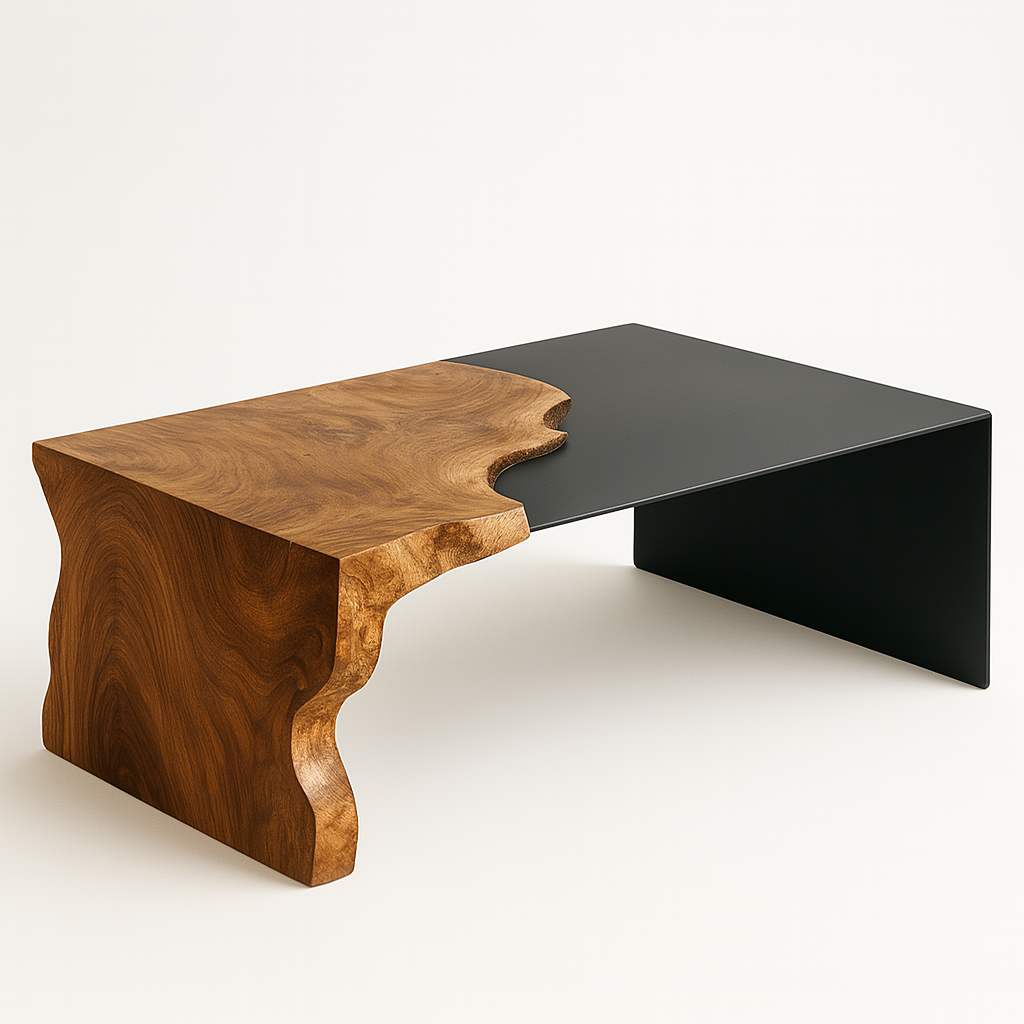 A live-edge wood slab flows seamlessly into a sleek folded metal plane – SplitFlow Coffee Table captures the dynamic meeting of nature and modern design. One half celebrates the organic drama of raw grain and undulating edge, while the other offers a crisp, monolithic surface. This bold juxtaposition turns a simple table into a statement of form, function, and fluidity.