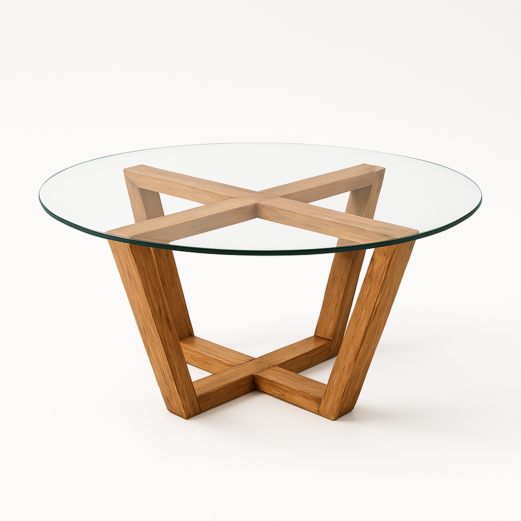 A round tempered-glass top floats above a radiant lattice of solid oak beams, creating a sculptural interplay of light and form. The Stellar Weave Glass Coffee Table invites you to appreciate natural grain from every angle, its airy surface showcasing the craftsmanship woven beneath.