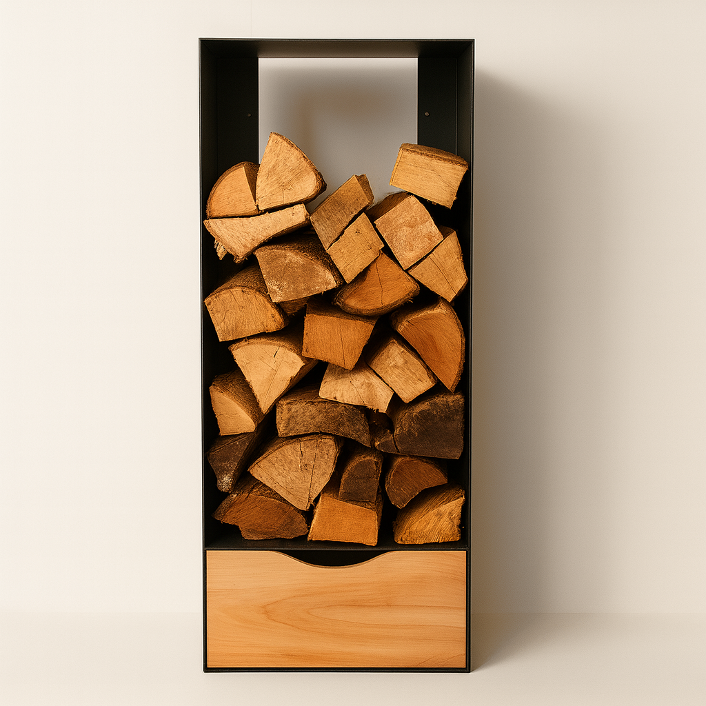 The WoodFront Firewood Stacker combines sleek steel framing with a natural timber accent for a warm, modern look. Its tall, open design provides ample log storage, while the solid wood front panel adds visual interest and conceals kindling or smaller pieces. Perfect for both contemporary and rustic interiors.